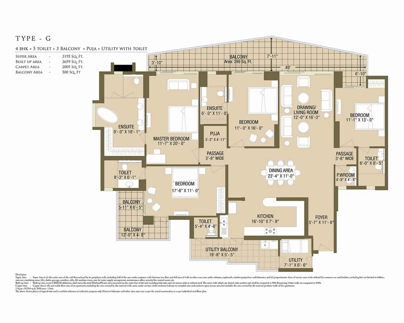 | 4 BHK+5T+PUJA+U (Type G) | 3195 SQ FT | ₹ 3,03,52,500/- | ENQUIRE NOW |